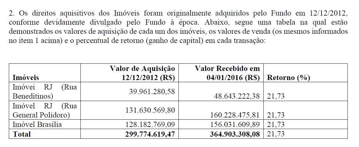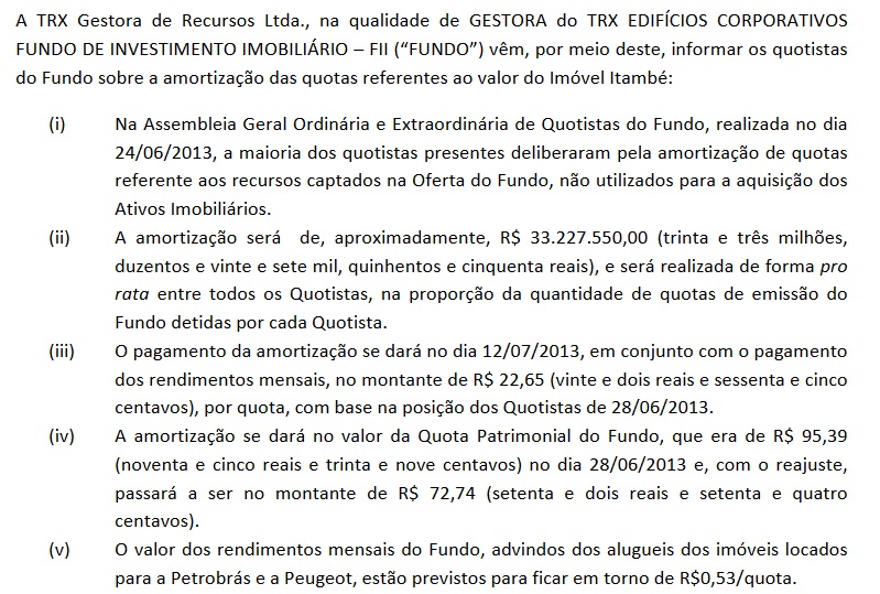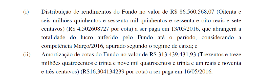 Quase quatro meses após o fato da venda dos imóveis, o fundo veio ao mercado comunicar os cotistas que estaria fazendo a amortização das cotas.