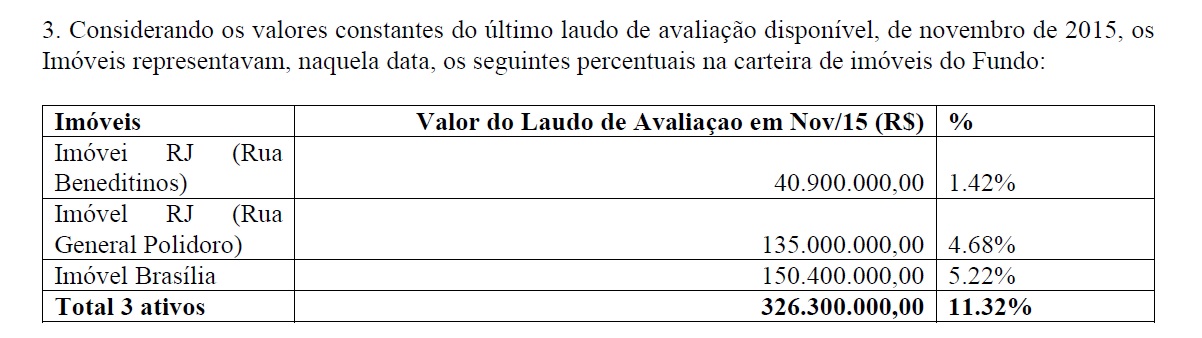 Além da redução ocasionada pela amortização referente a venda dos empreendimentos, o fundo também passou por uma reavaliação patrimonial.