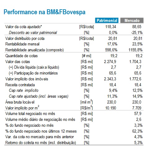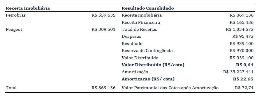 Houve uma distribuição bem superior aos valores pagos anteriormente, e somado a isso, temos a amortização, que “devolveu” aos investidores, cerca de R$ 16,00 do valor patrimonial do fundo.