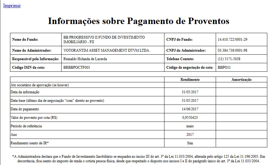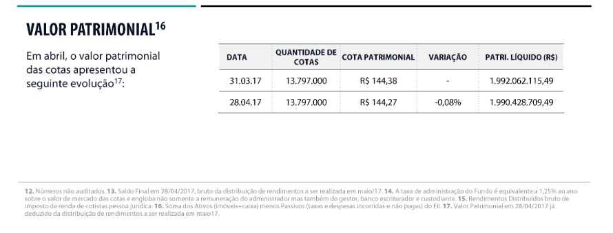Segue trecho do inicio do informe mensal de um FII, o fundo em questão é o BBPO11, relatório referente 05/2017 :