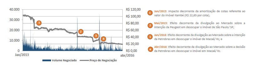 O valor de mercado também sofreu uma grande depreciação, saindo dos quase R$ 100,00, e chegando a bater os R$ 88,00 por cota depois das amortizações.