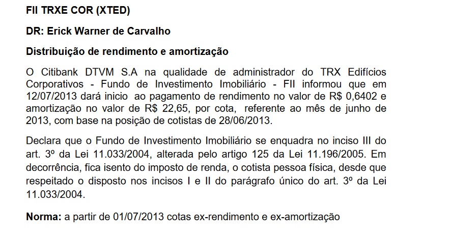 Logo nos primeiros meses de negociação e XTED11, que comprou as cotas na oferta pública, obteve parte do valor devolvido, através de uma amortização que ocorreu. Segue trecho do comunicado:
