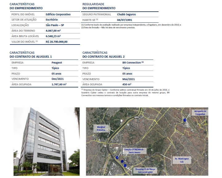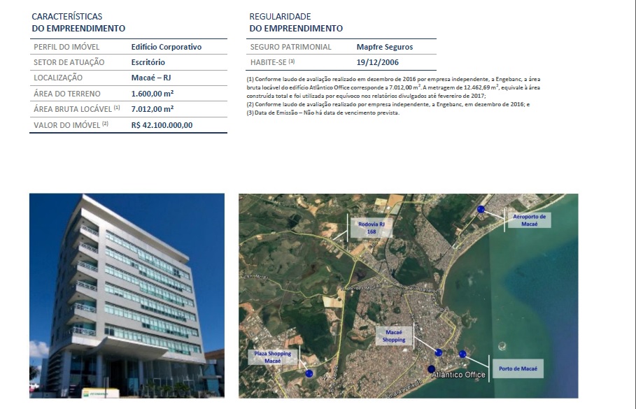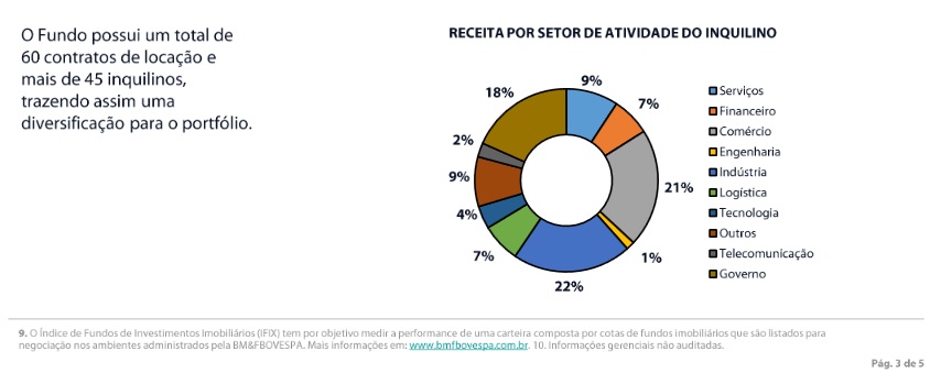 Isso se deve a diversificação nos tipos de imóveis, e nos diferentes inquilinos. São ao todo 9 edifícios corporativos e 7 galpões logísticos. Segue imagem retirada do relatório gerencial do fundo referente Maior/2017.