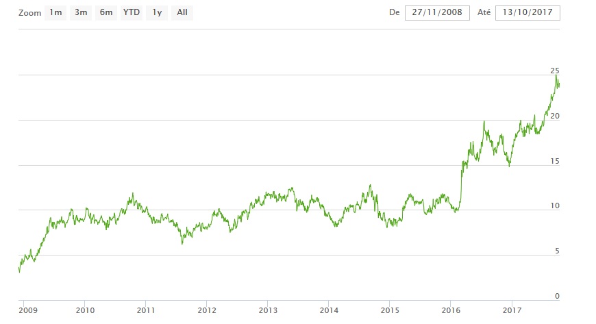 Na imagem acima o leitor pode conferir a evolução de BVMF3! Saindo dos quase R$ 4,00 por ação, e chegando aos atuais R$ 23,76! Um rendimento de 494%! Sem contar as distribuições de lucros e juros sobre capital próprio!