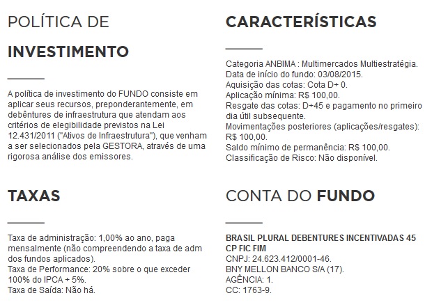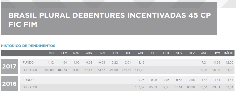 O próximo fundo que veremos é o Brasil Plural Debêntures Incentivadas 45 CP FIM. Esse fundo é derivado de outro fundo do Banco Plural. Segue imagem com o desempenho do mesmo: