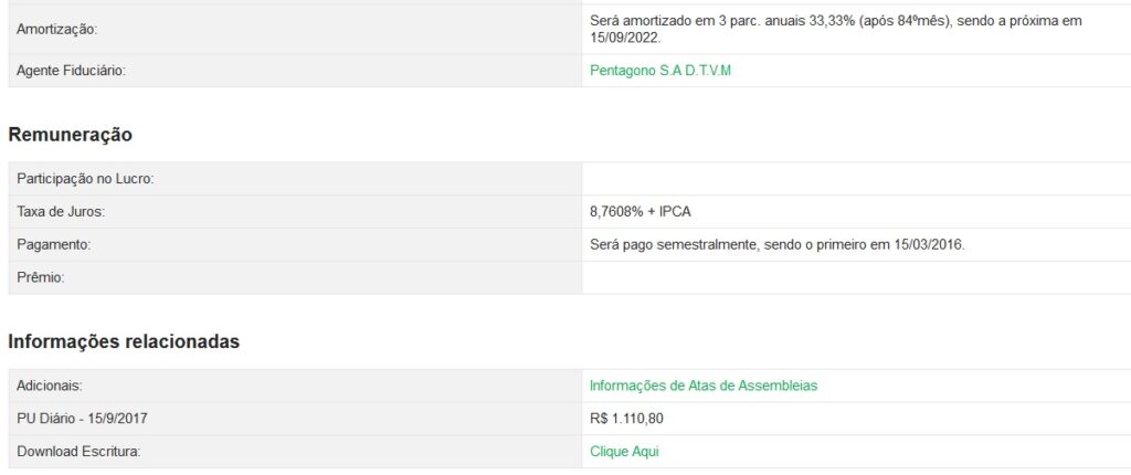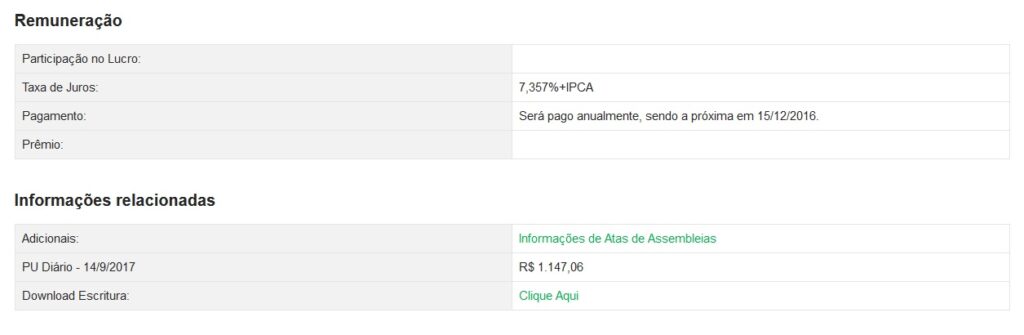 Nessa imagem acabei destacando o valor do PU ( Preço Unitário) da debenture e a remuneração da mesma. IPCA + 7,357% de rendimento é muito bom!