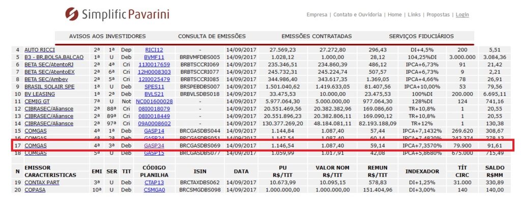 Analisando uma das debêntures que aparece na lista cima, vamos pegar o ativo relacionado à empresa Comgás para analisar. Com os dados coletados, podemos ir até a página da BM&F e realizar a pesquisa, segue: