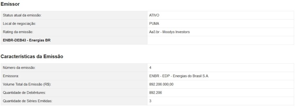 As debêntures da empresa Energias Brasil possui rating Aaa3Br, isso significa que nacionalmente tal ativo possui um bom grau de investimento.