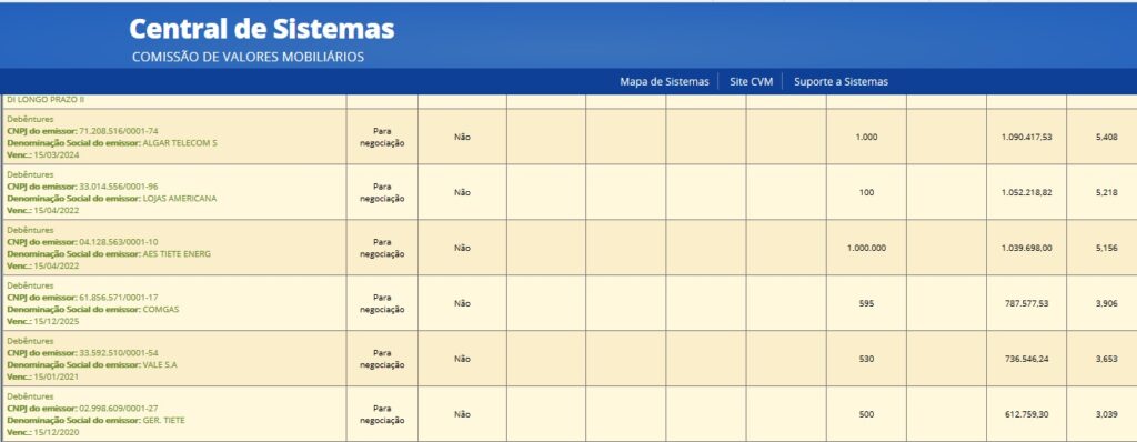 Verificando a página toda, podemos conferir a composição da carteira, com as informações de cada debênture investida.
