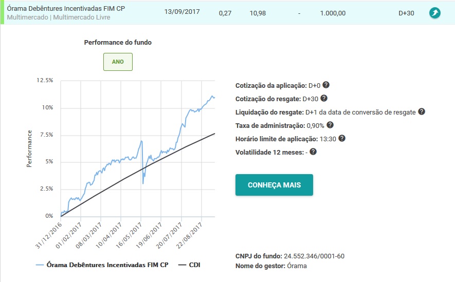 Fundo da Órama Debêntures Incentivadas FIM está conseguindo em 2017 um rendimento muito superior ao DI. É preciso levam em conta que o DI no momento está em queda. Ou seja, a taxa de juro está sofrendo reduções e, portanto isso amplia ainda mais a distancia entre os rendimentos.