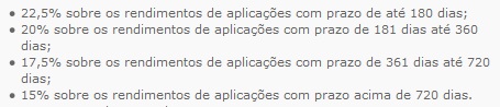 Assim, toda vez que um pagamento desses ocorrer, haverá uma retenção de IR. Segue tabela com as alíquotas para cada período: