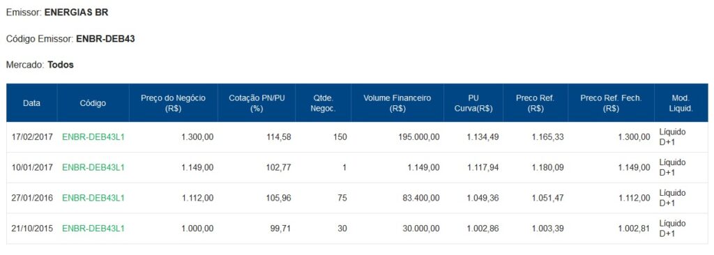 Isso se deve a expectativa do mercado! No último negócio da imagem, temos uma transação que envolveu 30 debêntures da Energia Brasil. Nessa em particular houve um pequeno prejuízo, de R$ 2,86 em cada debênture.
